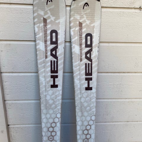 Head skidor med bindningar. Skidorna har ett mönstrat vitt och mörkt utförande och är utrustade med justerbara bindningar. Passar för alpin åkning. Exakt längd och modell framgår inte av bilden.
