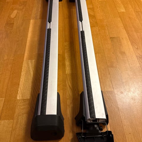 Volvo takräcken i aluminium med svarta plastfästen med skidhållare för 6 par skidor, låsbara.