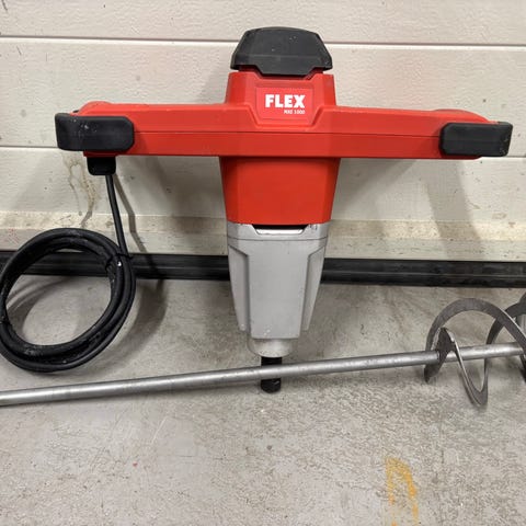 Milwaukee omrörare med visp i röd och svart färg. Elverktyg avsett för blandning av till exempel färg, bruk eller andra massor. Utrustad med långt blandarspiral/visp och extra handtag för bättre grepp och kontroll vid arbete.