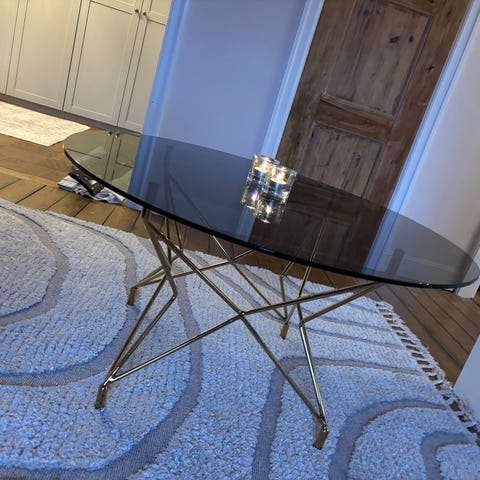 Runt soffbord med skiva i härdat glas, underrede i metall.