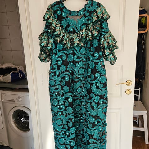 Vila festklänning för dam i storlek L. Klänningen är svart och tillverkad i polyester. Modellen har korta ärmar, markerad midja och ett yttertyg i transparent spetsliknande material med mönster. Passar till fest och andra mer uppklädda tillfällen.