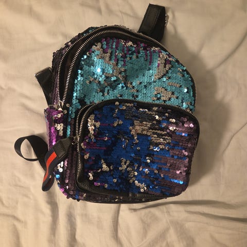 mycket fint skick, höjd 24cm (utan öron), djup 10cm, bredd ca 24cm, med vändbara paljetter