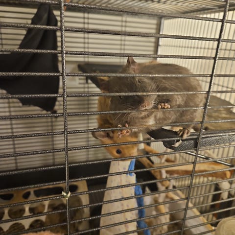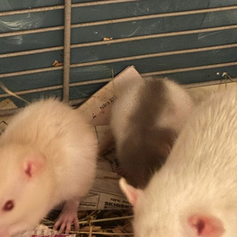 Hej jag har kommit till beslutet att mina 6 hanar ska få flytta, det är två flockar, 4 bor i en bur och 2 i den andra.. dom alla 6 funkar säkert med varandra men har inte testat, jag säljer dom då jag har fått diagnosen Me/cfs=kroniskt trötthetssyndrom så jag har för ont och är för trött i kroppen för att ge dom uppmärksamheten dom förtjänar, det följer med en bur den som är blå där två små vita råttor sitter -piff och puff, alla råttor är hur snälla som helst ingen problematik eller sjukdomar
