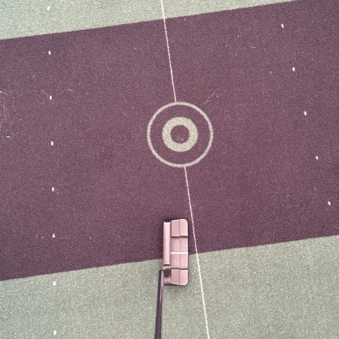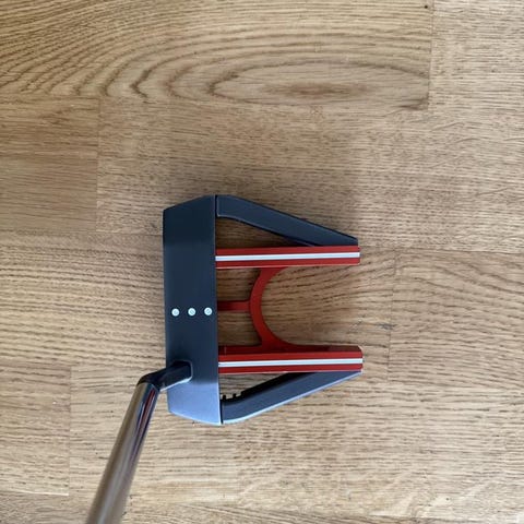 Odyssey Stroke Lab Seven putter i svart utförande. Putterhuvudet har tydliga siktslinjer och tre prickar på ovansidan för enklare linjering. Greppet är märkt med Odyssey-logotyp. Till puttern följer ett headcover med Stroke Lab- och Odyssey-brodyr.