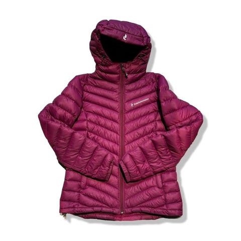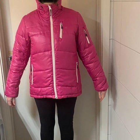 dunjacka för dam i storlek XS. Jackan är rosa och har yttertyg i 100 % nylon med innerfoder i 100 % polyester. Fyllningen består av 90 % dun och 10 % fjäder. Modellen har huva, dragkedja framtill och flera fickor med dragkedja både utvändigt och invändigt. Passar som ytterjacka i kallare väder.