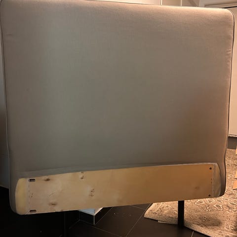 Jotex sänggavel med vävd framsida i beige textil. Sänggaveln är avsedd att monteras mot vägg med hjälp av infällda upphängningsbeslag på baksidan. Passar som ryggstöd bakom säng och kan användas för att ge en mjukare känsla mot väggen samt som dekorativt inslag i sovrummet.