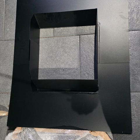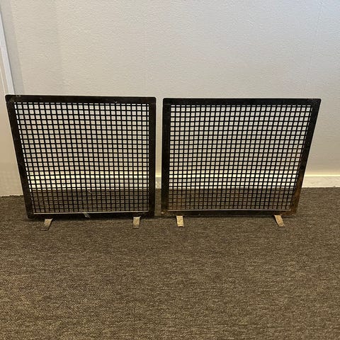 Gnistskydd i tredelad modell i svart metall. Skärmen har finmaskigt nät och dekorativa detaljer upptill och i mitten. Den står på två stadiga fötter och sidodelarna kan vinklas för att anpassas framför eldstaden eller kaminen. Bredden är totalt 80 cm (40+20+20cm), höjden är 42 cm plus smidet på toppen. Finns i Björkhagen.