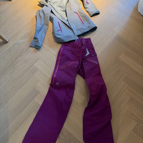 Skidset från Cross, Sweden bestående av en lila skidjacka och ett par mörkgrå skidbyxor med lila detaljer.. Jackan har huva och flera dragkedjeförsedda fickor framtill. Byxorna har dragkedjefickor på benen. Byxorna är Small (men är som stl. 40) och jackan är Large.