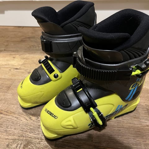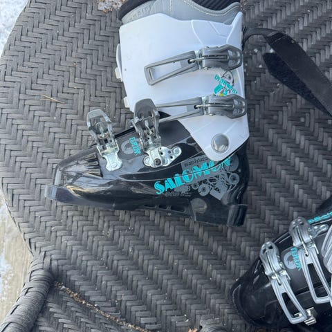 Salomon S/Max 60 RT pjäxor i svart med blå detaljer. Modellen har fyra justerbara spännen och powerstrap upptill för stabil passform. Storleksmärkning på hälen visar 22–22,5 (mondopoint 225). Pjäxorna är avsedda för alpin skidåkning och passar till standard alpina bindningar. Innerpjäxa med vaddering för komfort och hårt ytterskal för stöd och kontroll på skidorna.