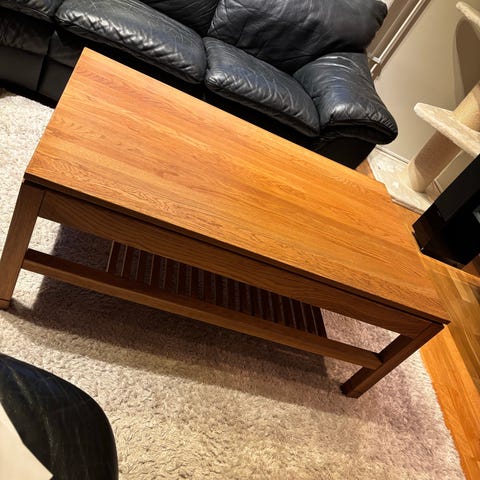 Soffbord, ekfaner. Ramen är rostfri stål. Nedre hylla i tjockt glas. Finns ett helt nytt skiva till den.