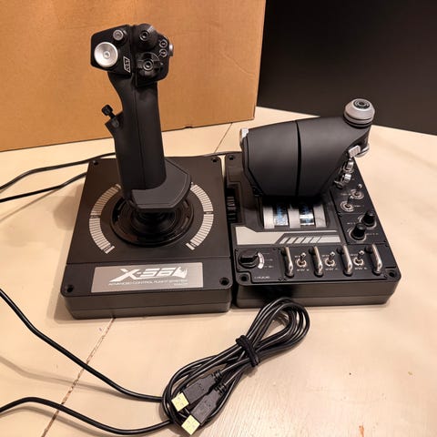 Logitech X56 HOTAS joystick och gasreglage i svart utförande. Setet består av en styrspak och ett separat gasreglage avsett för datoranvändning, exempelvis flygsimulatorer och andra spel som kräver precis styrning. Ansluts till dator som övrigt datortillbehör och ger möjlighet till detaljerad kontroll via flera knappar och reglage på både joystick och throttle-enhet.