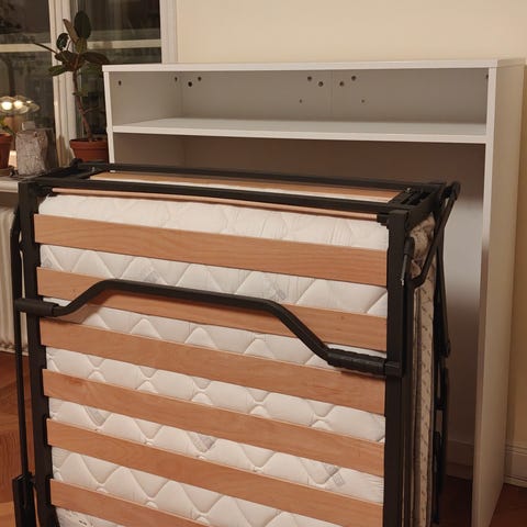 Jysk damsbro guest bed, 90 cm (bredd), 200 cm (längd). Fällsäng med ribbotten. Hopfällbar för enkel förvaring. Passar som extra säng i exempelvis gästrum eller som tillfällig sovplats. Madrass ingår enligt bild.
