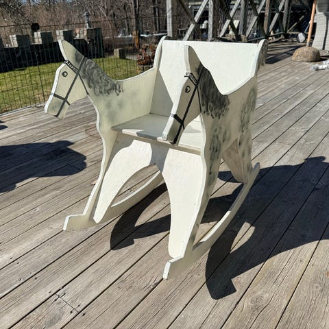 Trähäst gunghäst. Klassisk modell i trä med sits och fotstöd. Passar som inredningsdetalj i barnrum. Lite farlig för barn att gunga på :)