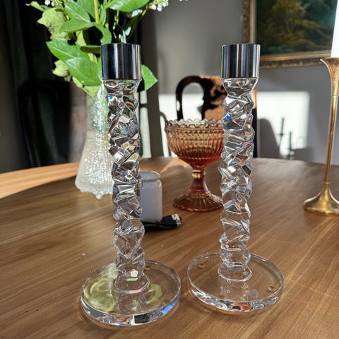 De två ljusstakarna på bilden är av modellen Blomman, formgivna av Sven Palmqvist för det anrika svenska glasbruket Orrefors. Dessa ljusstakar är tillverkade i klar kristall och har en karaktäristisk organisk form som påminner om en utslagen blomma.