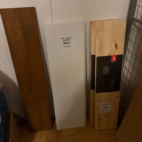 Säljer en hemmagjord hylla baserad på Elfa hyllsystem (från Clas Ohlson som sedan sprayats svarta) och med kapade hyllor av obehandlat furu från Bauhaus.