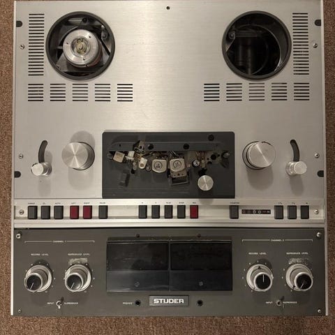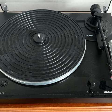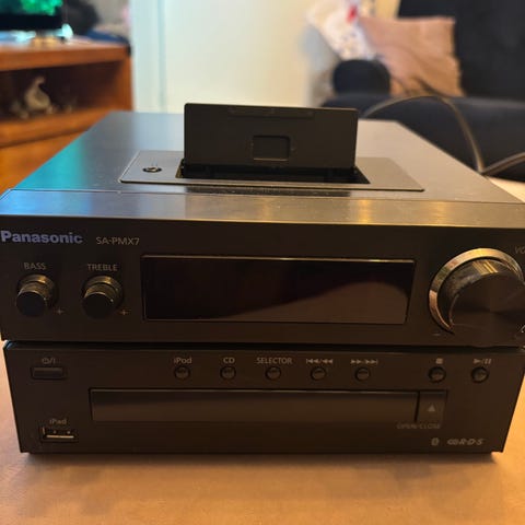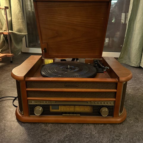 Stereoanläggning med inbyggd skivspelare och kassettbandspelare. Enheten har genomskinligt lock över skivspelaren och panel med reglage och knappar på framsidan. Passar för uppspelning av vinylskivor och kassettband i hemmamiljö. Två knappar är lösaFlera kontroller för volym och inställningar finns på fronten. Ej funktions testad pga att kontakten inte passar, vad jag vet skall den fungera