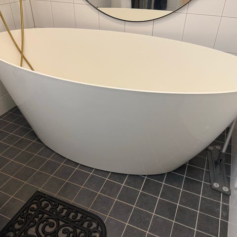 Fristående badkar. Oval form med släta sidor, enkel att rengöra. Badkaret är rymligt och bekvämt och riktigt snyggt.