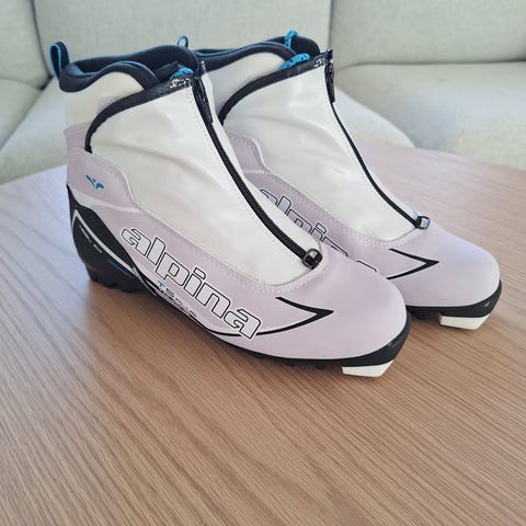 Strl 40 SNS pjäxor för längdskidåkning med SNS Pilot-sula. Skorna är blå med detaljer i beige, svart och vitt. De har högre skaft för bättre stöd runt fotled och häl. Passar för användning med längdskidor som har SNS Pilot-bindningar.