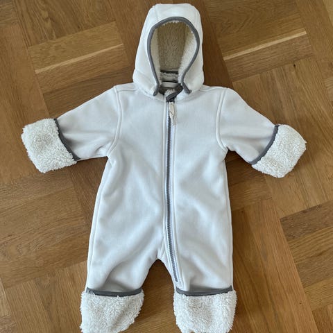 Zara babyoverall i beige färg för unisex, storlek 56. Overall i mjuk polyester med lång ärm och dragkedja framtill. Yttermaterialet har en teddy-/fleece-liknande struktur och insidan är fodrad med mönstrat tyg. Passar spädbarn i storlek 56 för vardagsbruk och ytterlager vid svalare väder.