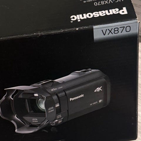Videokamera från Panasonic med 4K-upplösning. Kameran har 25x i.ZOOM och Leica Dicomar-objektiv. Den har även Hybrid O.I.S. (optisk bildstabilisering) och Wi-Fi-funktion. Modellen är HC-VX870.