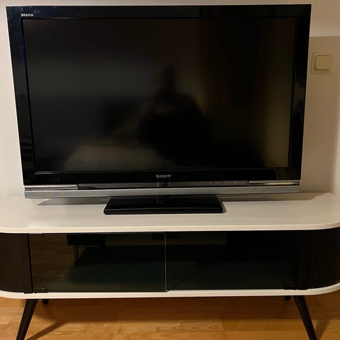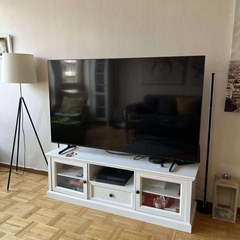 IKEA tv-bänk i vit färg. Toppskiva i glas. Möbeln har två dörrar framtill och invändiga hyllplan för förvaring av exempelvis mediautrustning, böcker eller andra saker. Ytan upptill kan användas för dekoration eller extra avställningsyta. Passar i vardagsrum eller andra rum där en låg förvaringsmöbel behövs.