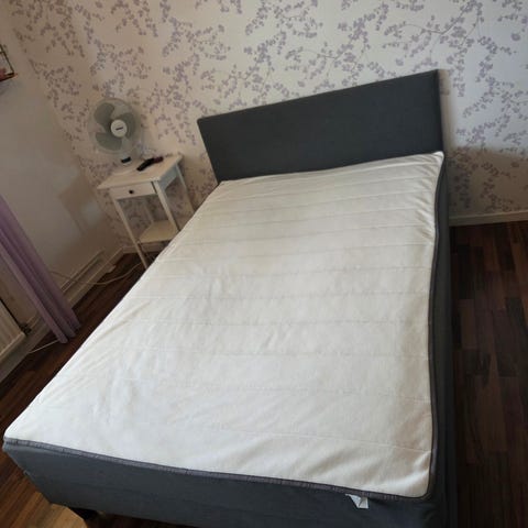 säng med sänggavel i svart tyg. Rektangulär sänggavel med rutmönstrad stoppning. Sängen står på ben och har en madrass med vitt överdrag. Passar som dubbelsäng eller rymlig enkelsäng i sovrum eller gästrum 140cm bred.
