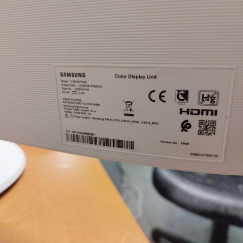 Samsung C32F391FWU Curved bildskärm med 32 tum skärmstorlek. På baksidan finns anslutningar för HDMI, DisplayPort och hörlursutgång samt strömanslutning.