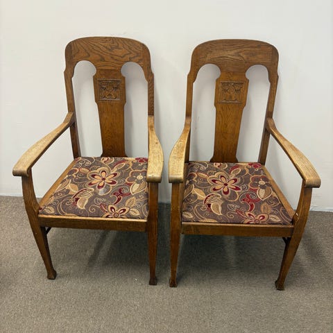 Trästolar med stoppad sits grön tygklädsel.