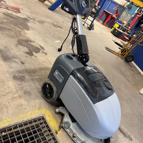 Hako Scrubmaster B12 golvtvättmaskin i röd och grå färg. Modellen är en gå-bakom-skurrmaskin avsedd för rengöring av hårda golvytor, exempelvis i verkstad, lager, butik eller andra lokaler. Maskinen har manöverpanel med tydliga knappar på handtaget och integrerad vattentank. Passar för daglig städning och underhållsrengöring av medelstora ytor där effektiv mekanisk skurning behövs.