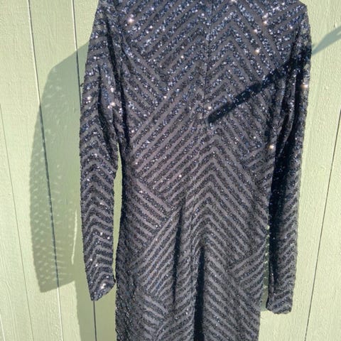 Svart klänning med långa ärmar och en guldfärgad dragkedja framtill. Klänningen har en figurnära passform upptill och en utsvängd kjol.