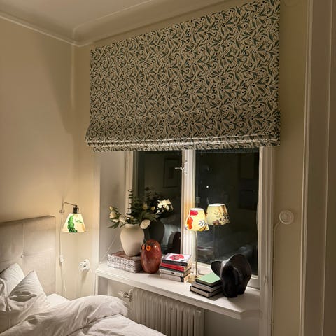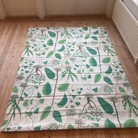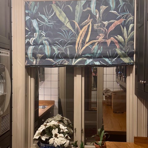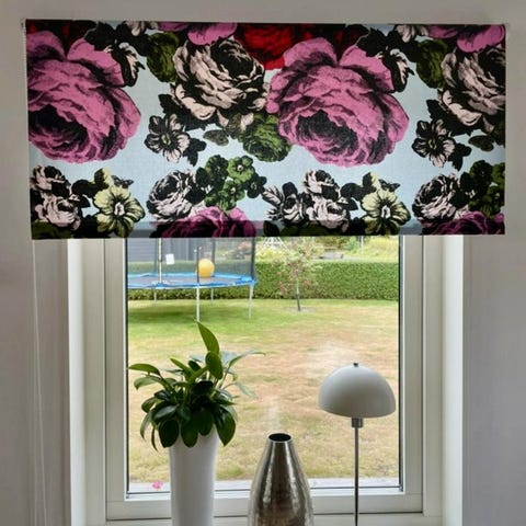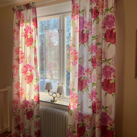 Underbar hissgardin i Svenskt Tenns tyg Teheran. Uppsydd hos sömmerska. Fodrad i vitt baktill men ej mörkläggande. Hissas upp med 4 paneler totalt med metallpinnar och snöre.
