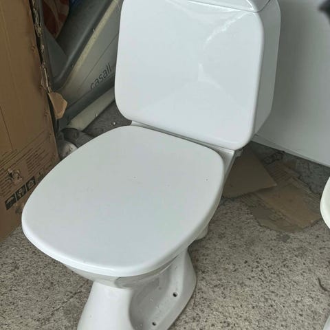 Golvstående toalettstol i vit färg med cistern och sits. Modellen har dubbelspolning via knapp ovanpå cisternen. Toaletten är avsedd för fast montering mot golv och anslutning till befintligt avlopp i badrum eller toalettutrymme. Självstängande toasits, nästan ny.