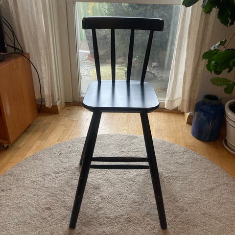 IKEA barnstol i svartmålat trä. Stolen har hög sitthöjd med fotstöd och ryggstöd med spjälor, lämplig vid matbord. Normalt bruksslitage.