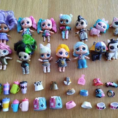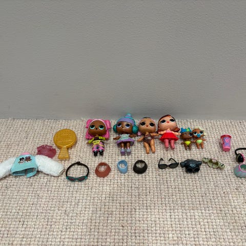 L.O.L. Surprise dockor med tillbehör. Flera små samlardockor med olika frisyrer, kläder och skor. Till dockorna ingår mindre tillbehör som muggar, flaskor, väskor och andra små delar. Passar för lek och samling för barn som gillar miniatyrdockor och rolllek.