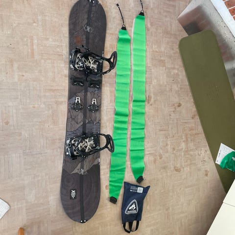 Fin splitboard med bra belag, inga större repor eller skador. Det som syns på bilden är smuts från lim från hudarna.