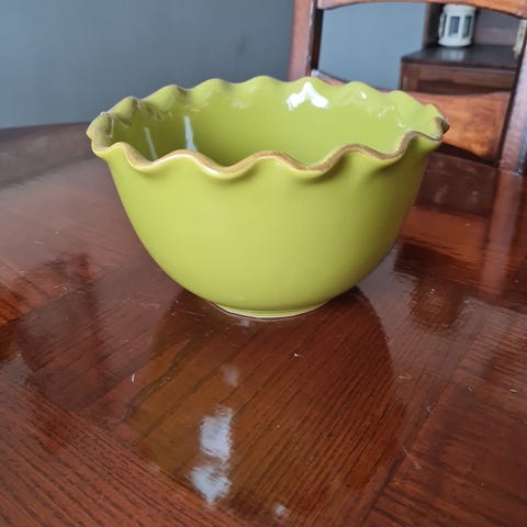 Skålen är formad som en pumpa med orange insida och gulgrön utsida. Diameter ca 33,5 cm. Passar för servering av sallad, frukt eller andra rätter och som dekorativ serveringsskål på bordet.