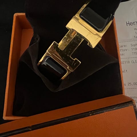 Hermès armband för kvinna. Styvt armband med mönstrad utsida och metallfärgad insida. Levereras i ask från Hermès enligt bild. Passar som accessoar till vardag och fest.