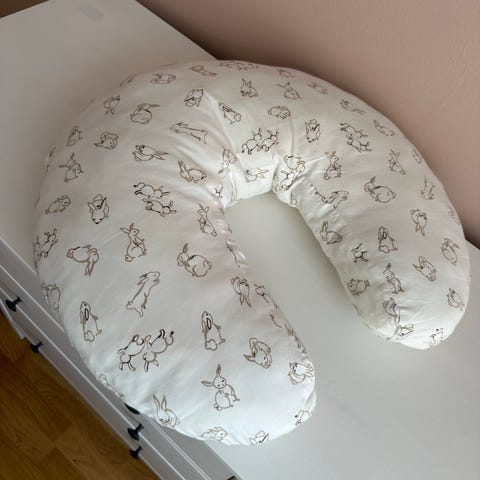 IKEA amningskudde i U-form i grå färg. Kudden ger stöd runt kroppen och kan användas vid amning eller flaskmatning för att avlasta armar, axlar och rygg. Yttertyget är av textil och kudden har mjuk fyllning som formar sig efter kropp och barn.