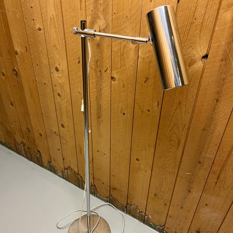 Fot av kromad metall, ställbar arm, för en ljuspunkt, textilklädd skärm medföljer (tror inte den är original).