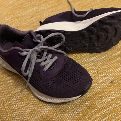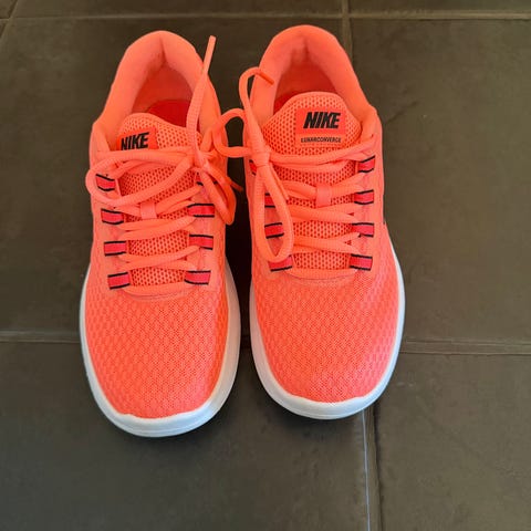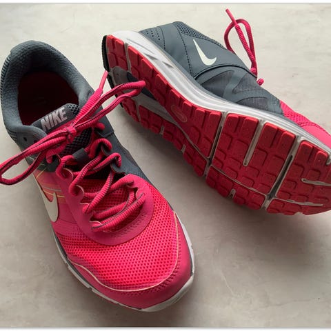 Löparskor i sneakermodell i storlek 38. Skorna är rosa med vit sula och har snörning framtill. Ovandelen verkar vara i ett ventilerande textilmaterial med meshstruktur. Yttersulan har mönster för grepp vid löpning och annan träning. Passar för löpning och vardagsanvändning.