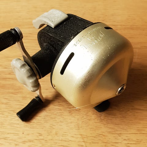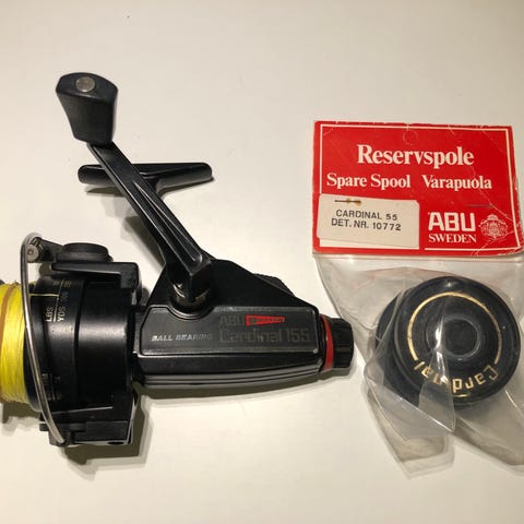 Abu Cardinal C-4 Special med vevhandtag i ädelträ säljes. Rullen är grön och original extraspole medföljer. Det finns inget originalemballage. Rullen är i bra skick med mindre spår av slitage. Senast använd 2001.