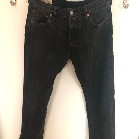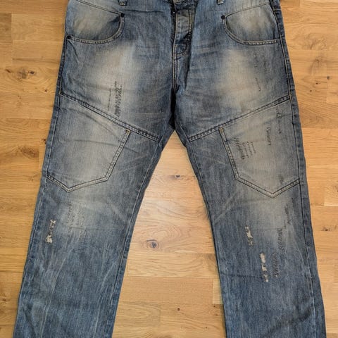 Fint begagnat skick. Notera att det finns slitage/frasning längst ner vid bensluten (hälarna), se närbild. Det finns även en naturlig nötning (cirkelformad fade) på höger framficka som ger byxorna karaktär.