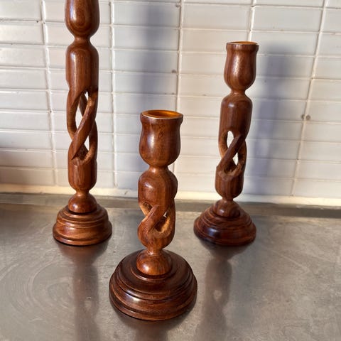 3 jättefina ljusstakar i olika storlekar. Dom är väldigt lätta och enkla, men är så otroligt fin på en hylla eller ett bord. Har 3 till. Alltså 6 totalt. Vill man ha dom andra tre utöver dom som är på bilden här, så skriv till mig så skickar jag med dom också men självklart annat pris då. Dom är gjord av plast.