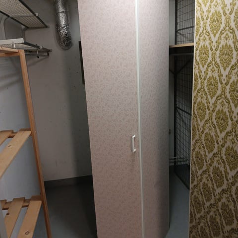 Garderobsskåp med en dörr och mönstrad framsida. Invändigt finns en övre hylla samt en bottenhylla med utrymme under för förvaring. Skåpet lämpar sig för förvaring av kläder, skor eller andra föremål i exempelvis hall, förråd eller källare.