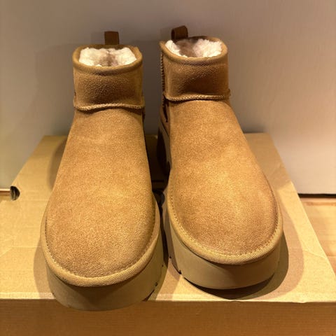 UGG vinterskor i storlek 42. Modellen är en låg, ankelhög känga med brun ovandel i mockaliknande material och ljus, mjuk pälsfodrad insida. Grovmönstrad yttersula i gummi för bättre grepp. Passar som varma och bekväma vinterskor i vardagen.