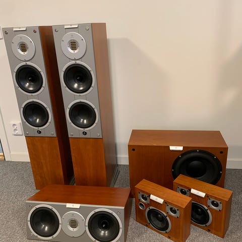 Kan användas som surround/bak högtalare med dubbla diskanter i dipol-läge eller som vanliga stereo med blecken på terminalerna borttagna och kopplas på de vänstra terminalerna sett bakifrån. Har en liten reparation i ena hörnet av ena högtalaren på baksidan, men inget som påverkar upphängning eller ljudkvalitet. Men sätter ett vettigt pris därför. Nypriset var ca 6000:-
