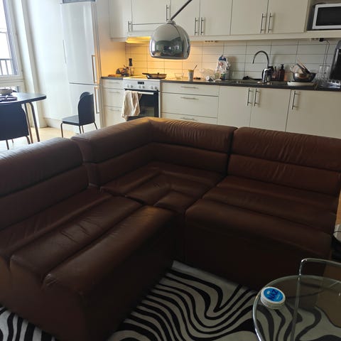 Snygg och stilren sittpuff i skinn som kan kombineras och ställas tillsammans med soffan eller fristående som sittpall /sittpuff eller soffbord.