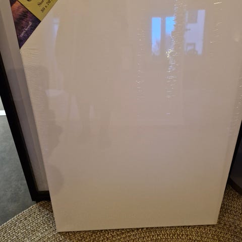 Hade tyg över efter gardiner, en tavelmakare spände upp på ram, men kom aldrig till användning.