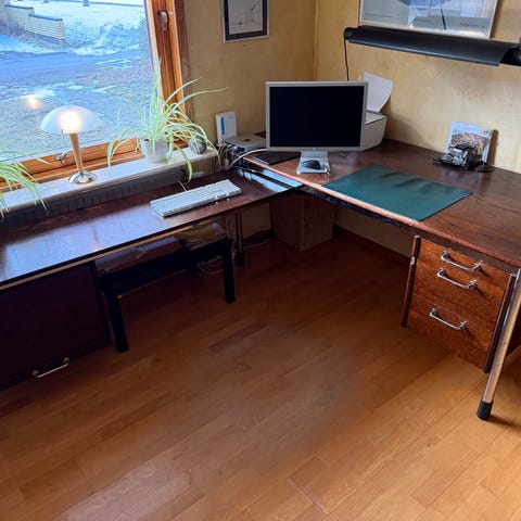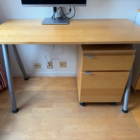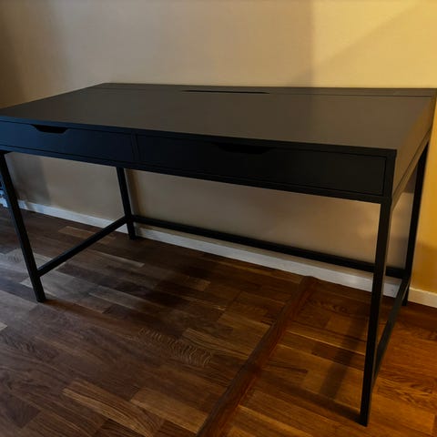 Skrivbord i svart utförande med två utdragbara lådor under bordsskivan. Ovansidan har en kabelgenomföring i ena hörnet för enkel hantering av sladdar. Bordet har en rak, modern design med hel skiva på ena sidan och öppen benställning på den andra. Passar som arbetsbord eller datorbord i hemmakontor, vardagsrum eller sovrum.