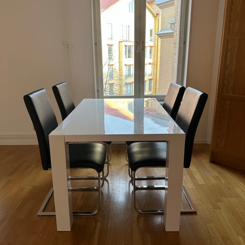 Matgrupp bestående av rektangulärt matbord med flera stolar i vit färg. Bordet har slät bordsskiva och raka ben. Stolarna har ryggstöd med spjälor och sitsar med dynor. Passar som matplats i kök eller vardagsrum och ger plats för flera sittande runt bordet.